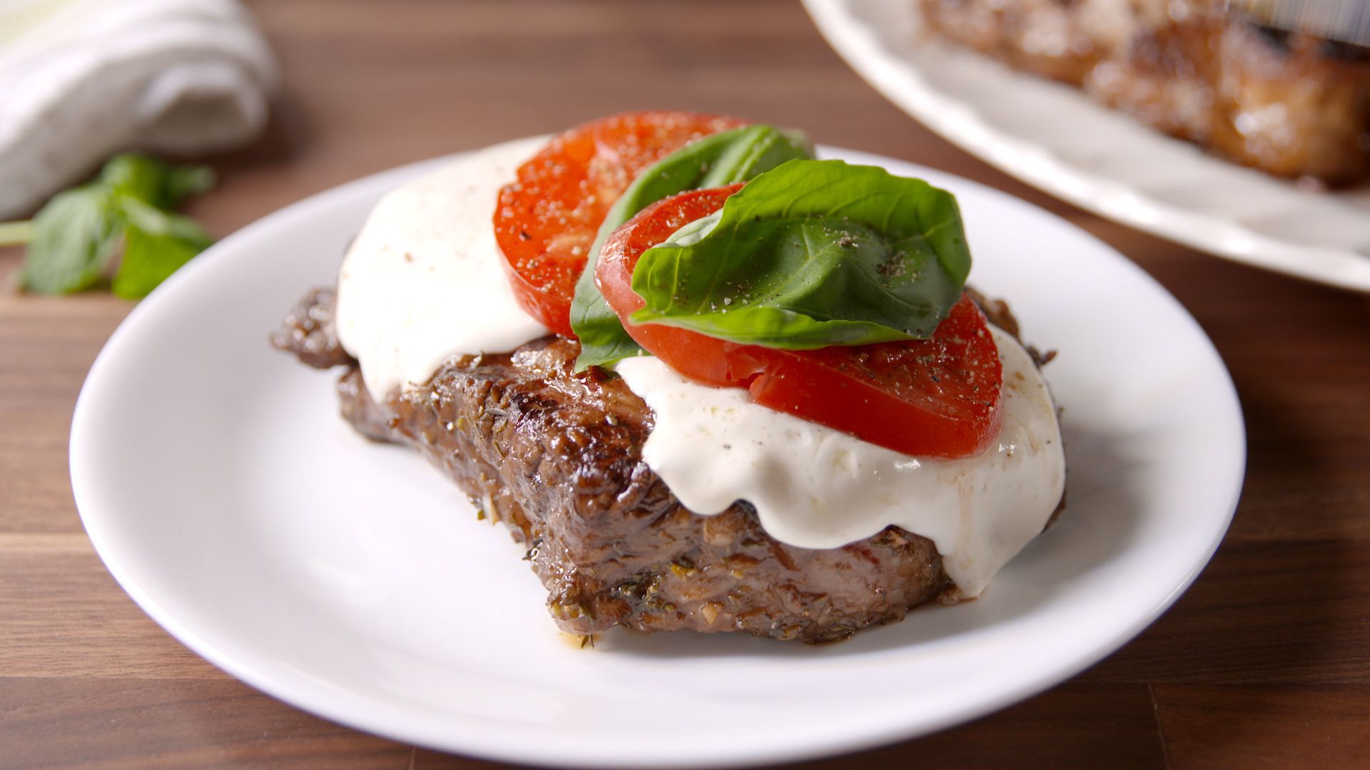 - Heat grill to high. Grill steak 5 minutes per side, then top with mozzarella and tomatoes and cover grill until cheese is melty , 2 minutes.