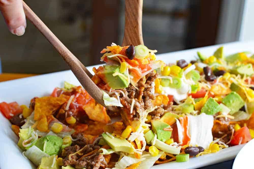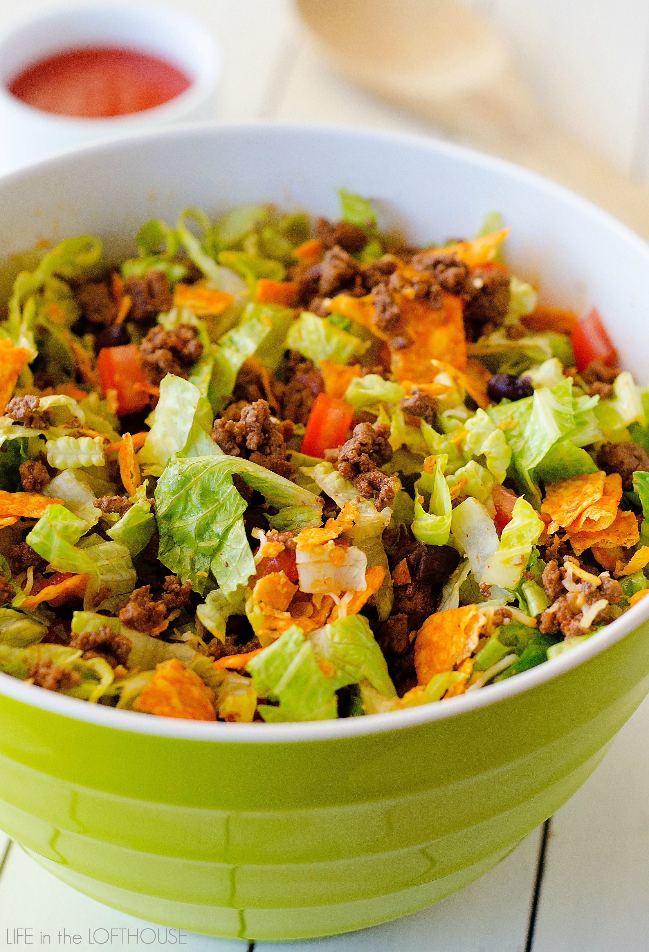 - Assemble salad: Toss chopped lettuce, cooked ground beef, cherry tomatoes, black beans, cheddar cheese, avocado, cilantro and pico de gallo (tomato salsa) together in a large serving bowl. Serve with sour cream and lime wedges.